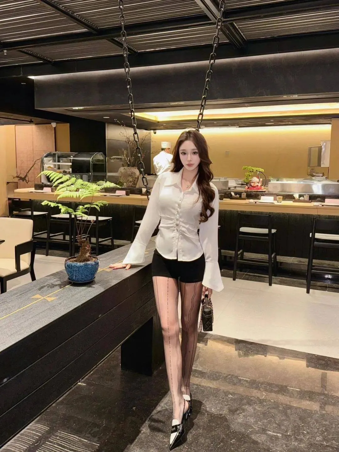 原創白色喇叭袖襯衫+黑色短褲+豎線裝飾絲襪+黑白拚色高跟鞋,都市摩登,時尚魅力新風尚 寶子們,時尚總是在不經意間給我們帶來驚喜,今天要分享的這套穿搭,簡直是都市摩登風的典範!它將簡約與時尚完美融合,展現出獨特的魅力。