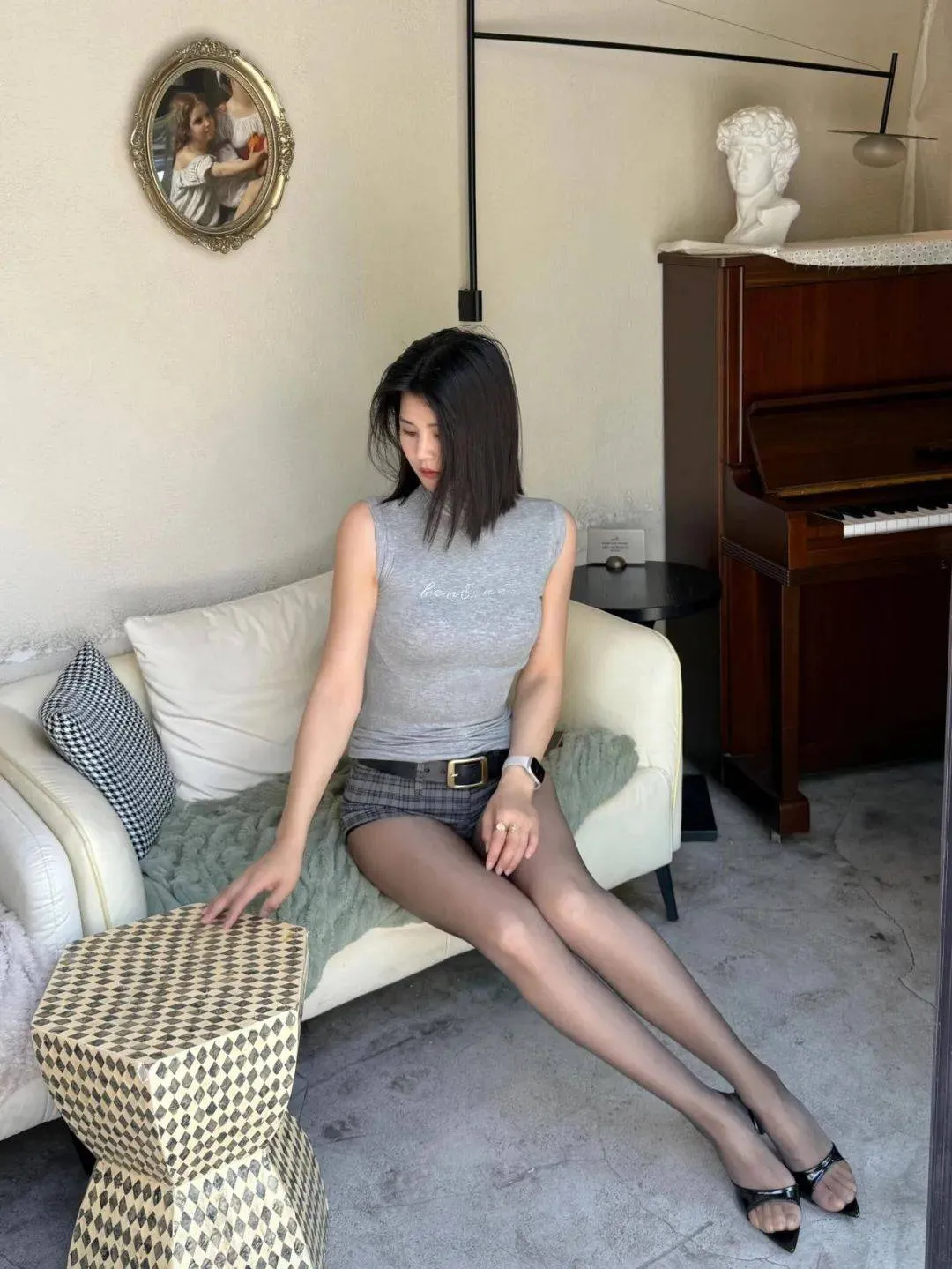原創灰色無袖背心+格紋短褲+黑色高跟涼鞋+簡約配飾,休閑酷颯,都市時尚氣場擔當 寶子們,在忙碌又充滿活力的都市生活中,一套既休閑又酷颯的穿搭能讓你輕鬆應對各種場景。就像這位美女博主的造型,用簡約的單品打造出超有範兒的時尚 look。